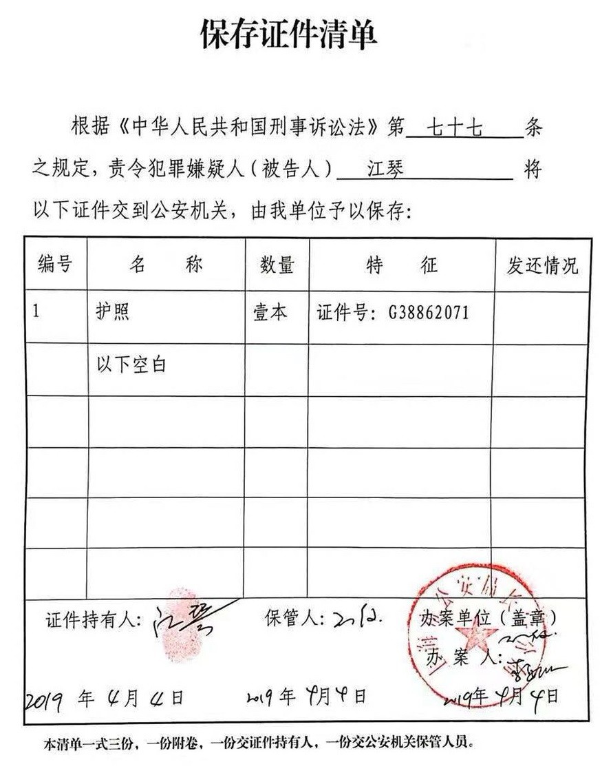 江琴在其申请书中写道:“申请人因合法诉求、进京维权被以所谓‘通缉犯’押回上海,甚至以莫须有罪名受到29天刑事拘留处罚,于2019年4月4日释放时办案警察又出具了《保存证件清单》以保存为由扣留了申请人回美国的‘护照’。