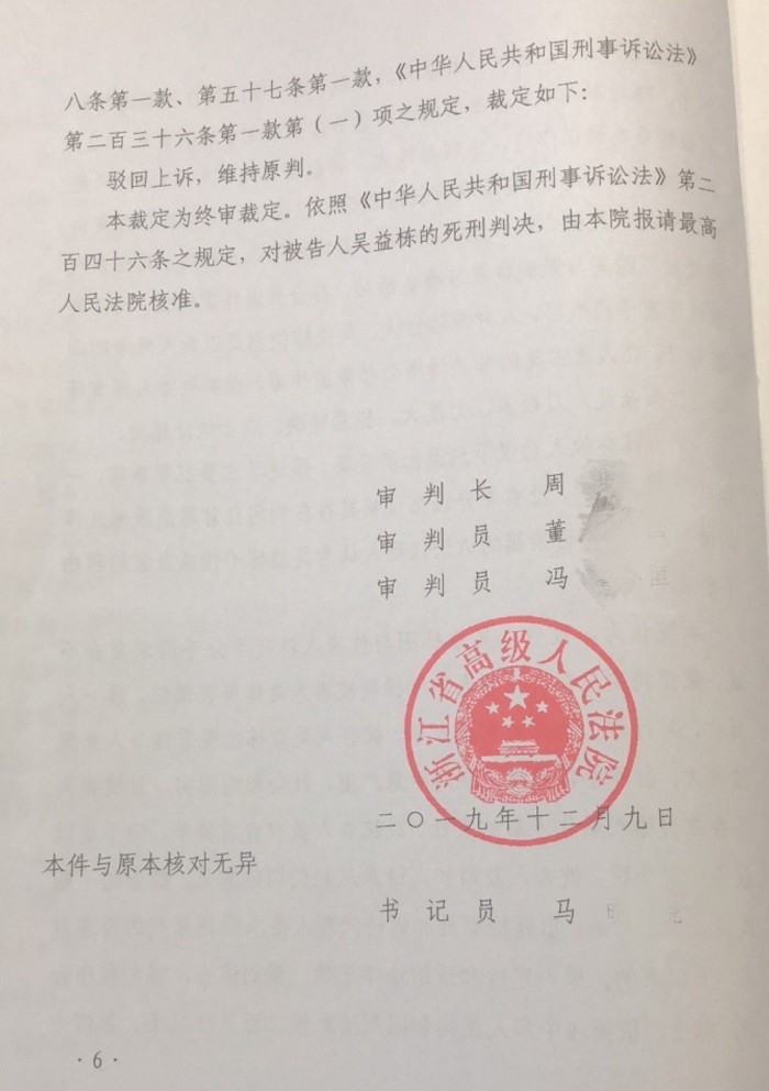 二审判决书显示,浙江省高级人民法院驳回吴某栋上诉,维持原判。受访者供图