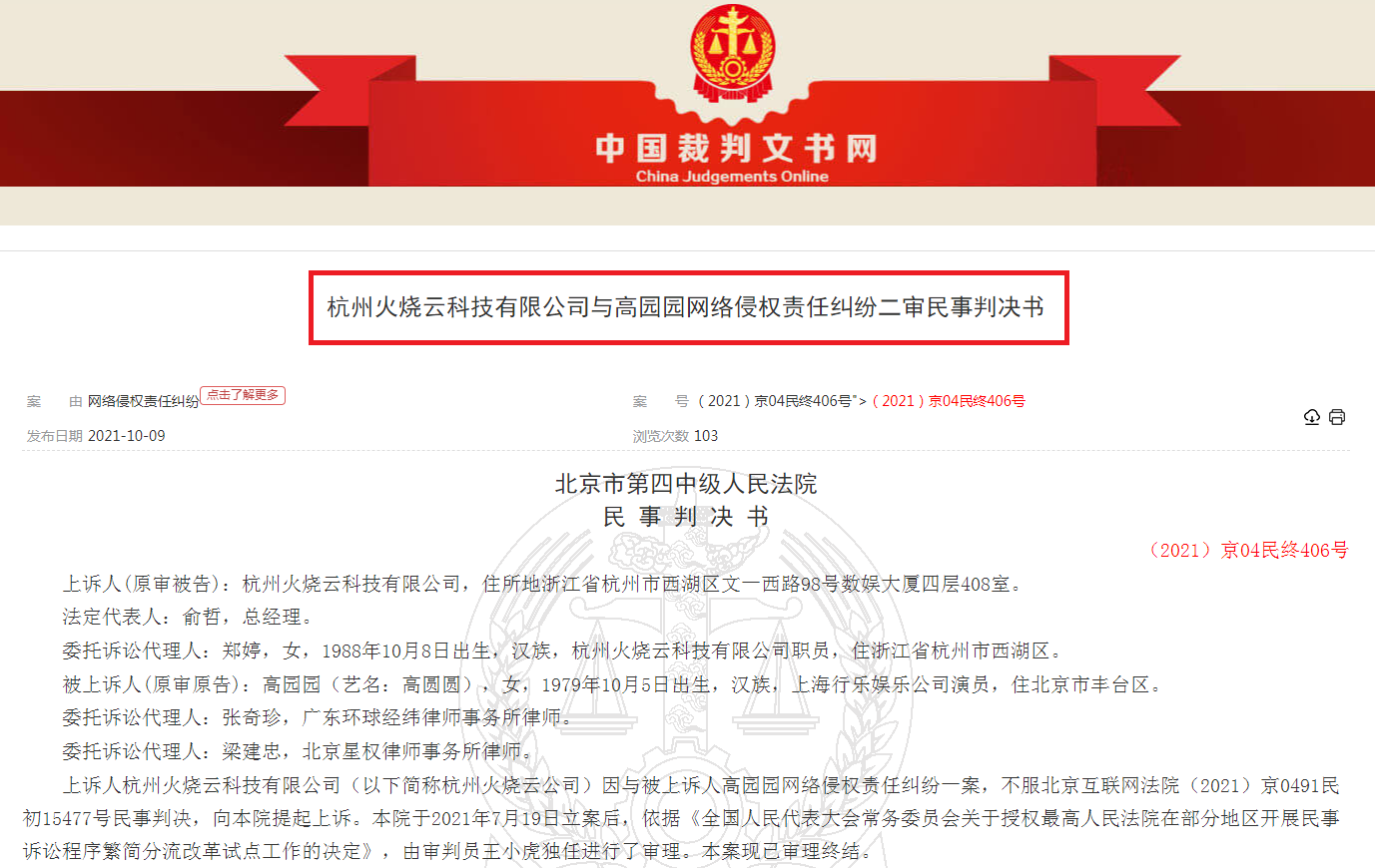 据“中国裁判文书网”显示,10月9日公开“杭州火烧云科技有限公司”与高园园(艺名:高圆圆)网络侵权责任纠纷二审民事判决书,案由是网络侵权责任纠纷。