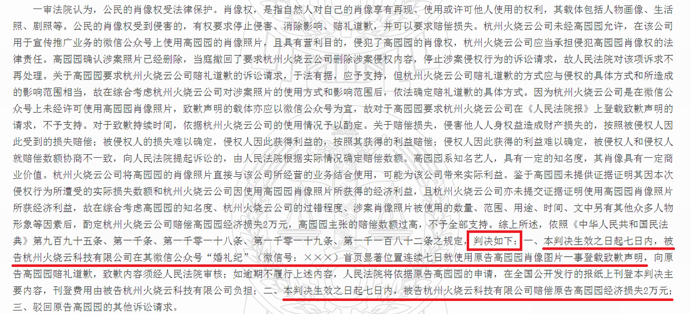 法院最终判决,“杭州火烧云公司”须赔偿高圆圆经济损失2万元,并在微信公众号上道歉七天。