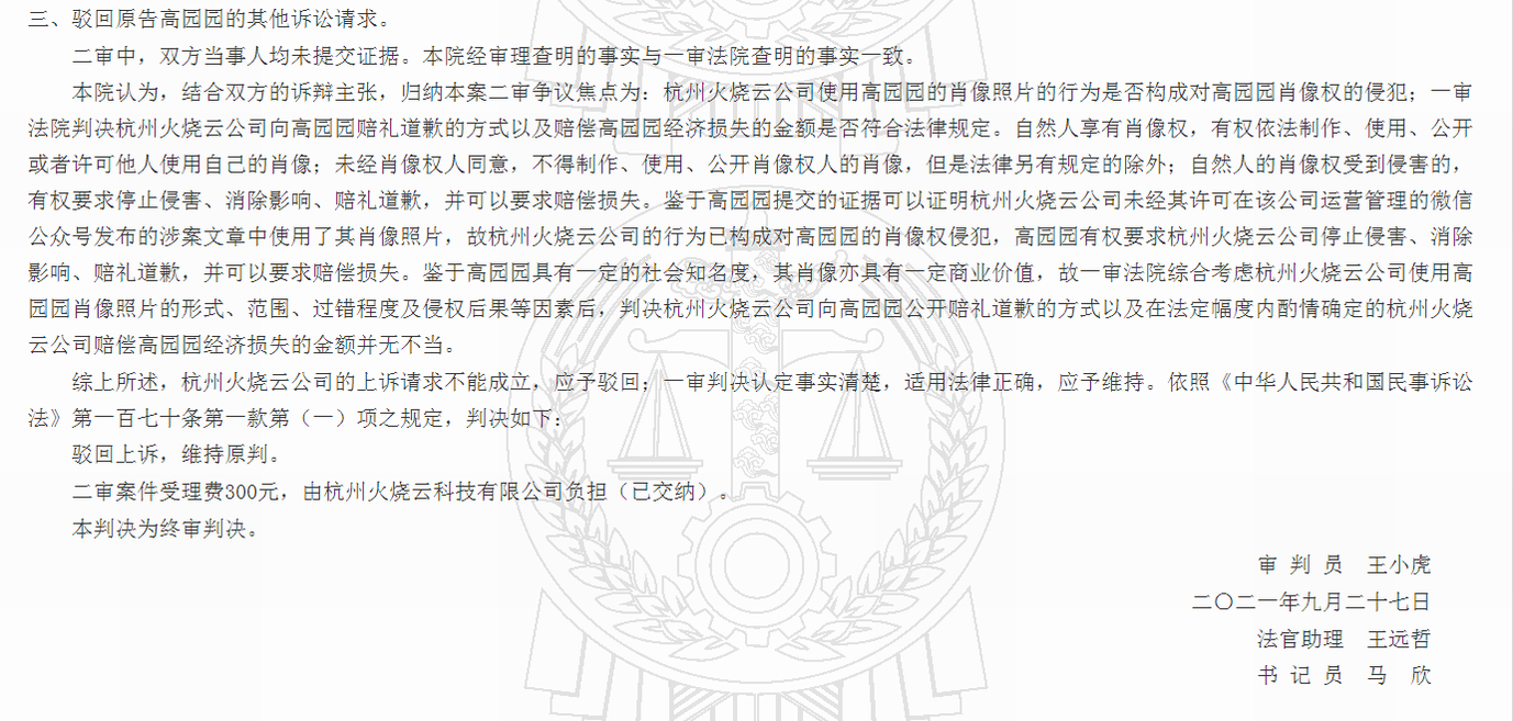 判决书写道,“高园园”提交的证据可以证明,“杭州火烧云公司”未经许可,在该公司运营管理的微信公众号使用了她的照片,侵犯其肖像权。鉴于高园园具有一定的社会知名度,其肖像亦具有一定商业价值,“高园园”有权要求“杭州火烧云公司”停止侵权、消除影响、赔礼道歉,并可以要求赔偿损失。据此驳回杭州火烧云公司的上诉。