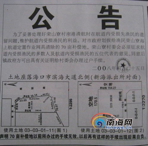 2008年4月25日,西秀镇人民政府在得到秀英区政府的指示后,又给荣山寮村会下发通知。该通知明确提到:荣山寮村委会必须征得航道内受损渔民的多数人及航道内受损渔民的五位代表的意见,同意后镇政府方可出具有关证明给村委会办理过户手续。并将西秀镇人民政府的指示在海南日报公告。