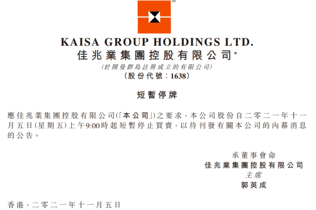 ▲11月5日上午9:00,佳兆业集团在港交所公告暂停交易(图片来源:网络)