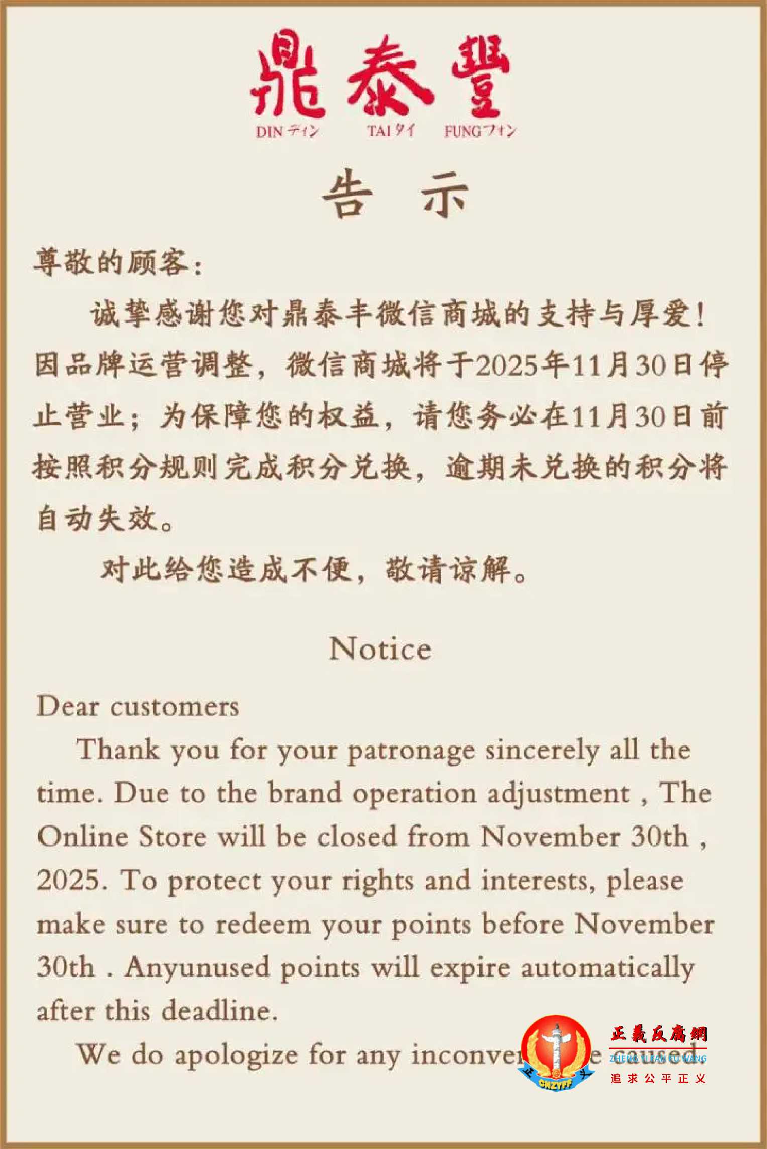 10月10日,台湾知名餐饮企业“鼎泰丰”发布告示称:官方微信商城将于2025年11月30日停止营业;为保障顾客的权益,顾客务必在11月30日前按照积分规则完成积分兑换,逾期未兑换的积分将自动失效。