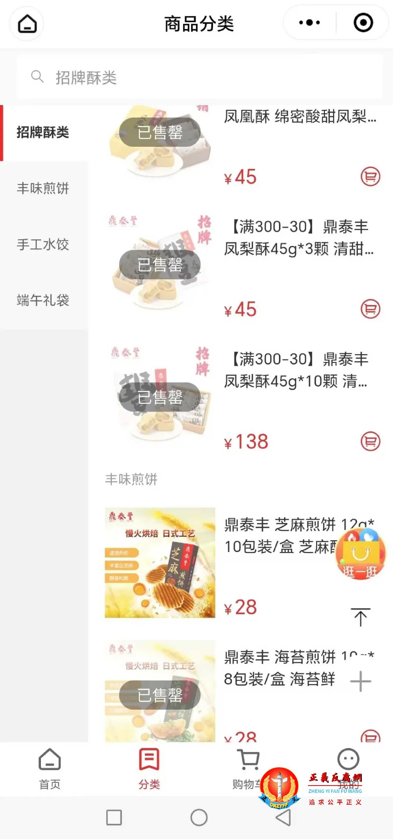 ▲查询鼎泰丰微信商城发现目前该商城仅有一款芝麻煎饼可供出售,显示其余商品均已售罄。(图片来源:鼎泰丰微信商城 / 截图)