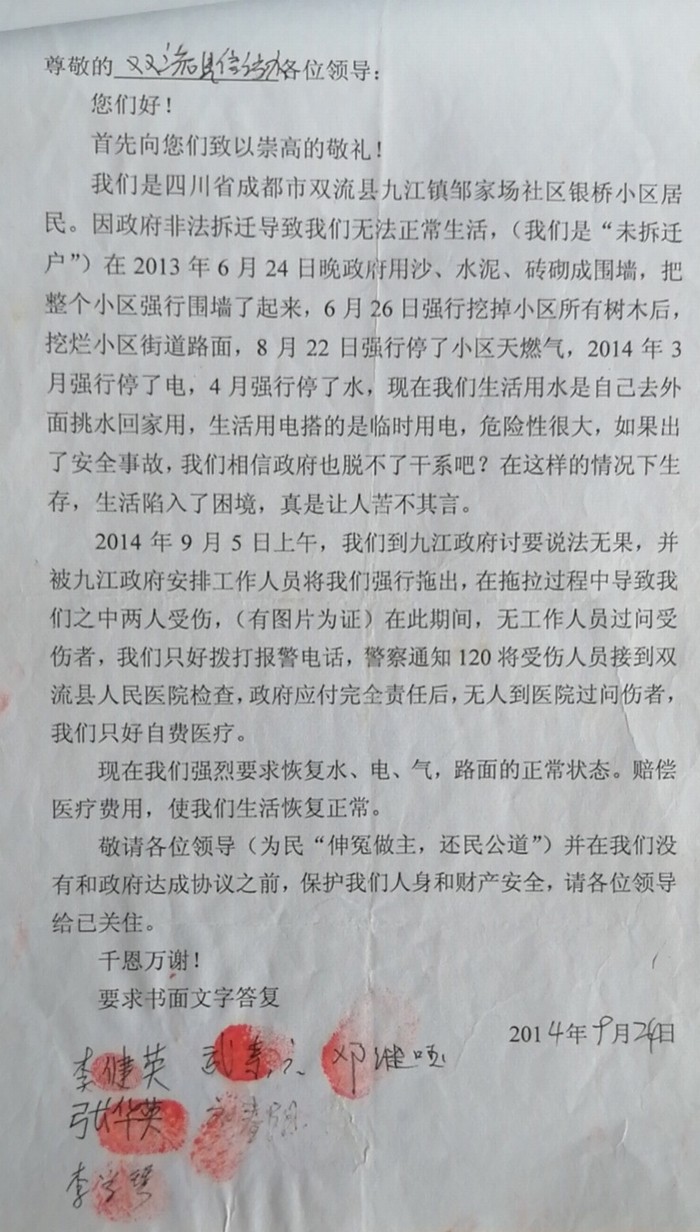 ▲业主给双流区信访办领导的求助信。(受访者提供)